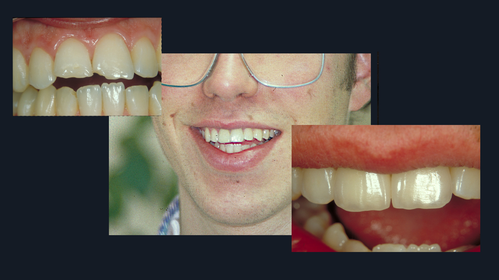 This was a simple case made as two single PFM units. The injury was due to a skate board incident. The reason to use high content gold alloy was the palatal aspect needed to match the concavity of the palatal aspect to maintain the original anterior guidance, the gold acts in the same way as the natural attrition of enamel as it will wear in a similar way. Gold content was 80%. The models were mounted by a facebow to get the correct occlusal inclination. Condyle inclination was not required as the anteriors could be medially tracked using a Stuart articulator. The final and most difficult part to finalize this case was to match the exact texture of the existing anterior surfacing as this patient was young. That was done by hand ceramic scraping and texturing with carborundum paste, not diamond paste.