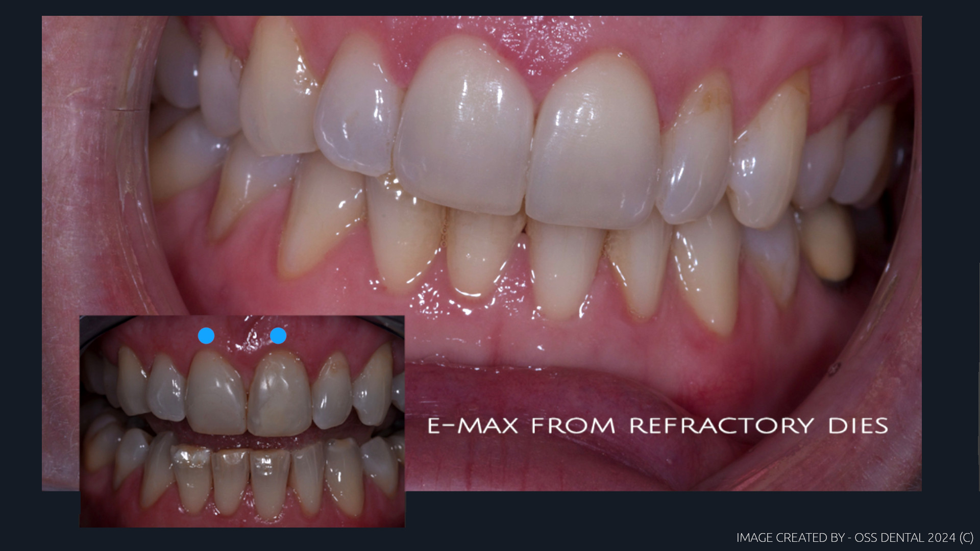 Case No.11; Another example of mixing PFM and IPS Emax veneers can be tricky owing to different light transmissions. But having done so many it is straight forward. The reason we still ise PFM is because of its refractive index in changing light, room, time, season ,latitude. Skills not to be lost but can be taught.