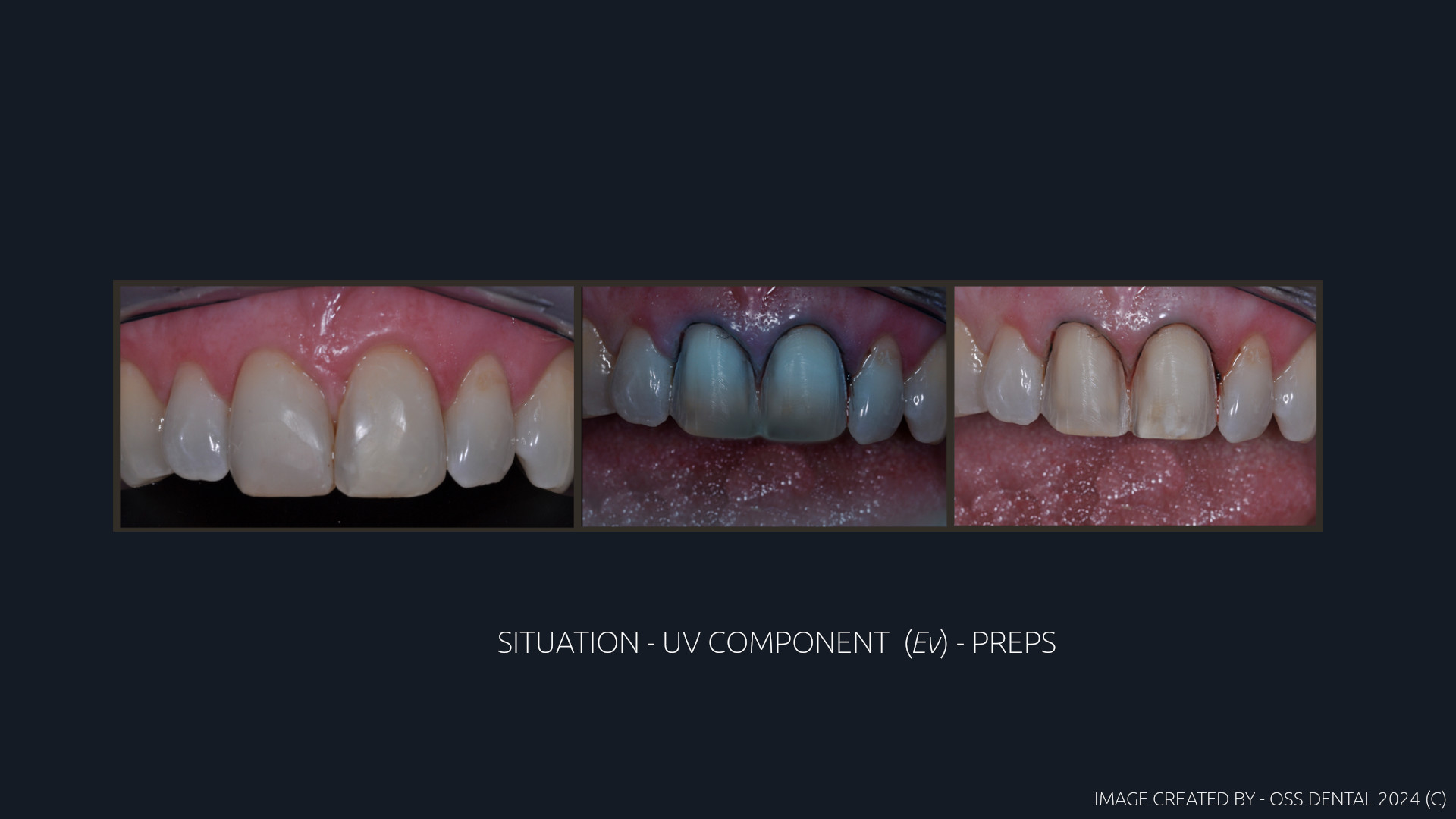 Case No.11; These two central veneers were a science challenge in how to make ceramic detractive due to a strong fluorescent component in the dentine. I made them in London in the Winter. The preps under UV light had a strong fluorescent content which would have been better to have been done in the summer not the winter as UV light is weak at that latitude and more so in the Winter. One can ask depending on ones Latitude is why a dentist would ask for an A3 in the summer and a D3 in the Winter. Very common in the North hemisphere. Daylight is different in the Winter to the Summer and the UV component in sunlight is lower in the Winter. In Las Vegas these teeth would look completely different. Same issue with Emax. The reason for choosing veneers, both were dull in surface reflectivity and one was cracked. The patient liked the longer central which was cracked so both were treated with veneers. The other trick with veneers if there is no form change you can do a minimal prep and leave the interproximal area closed. If a form change is required consider opening the interproximal so the veneers can wrap around the teeth to get symmetry in form development.
